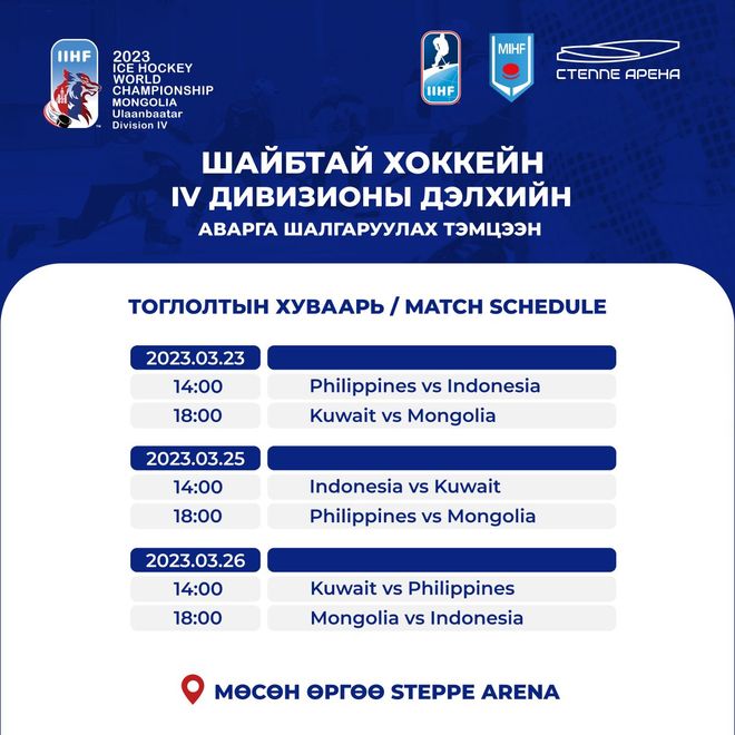 Монгол Улс анх удаа шайбтай хоккейн IV дивизионы дэлхийн аварга шалгаруулах тэмцээн зохион байгуулахаар болсон. Уг тэмцээн гуравдугаар сарын 23-26-нд болох бөгөөд Монгол, Филиппин, Индонези, Кувейт зэрэг орны баг тамирчид оролцох юм.