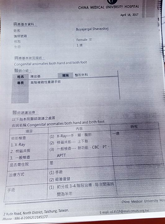 Охин маань 4-5 удаагийн хагалгаанд орно. Эхний ээлжинд хоёр хөлийнх нь тавхайг нийлүүлж оёх шаардлагатай. Энэ хагалгаанд ойролцоогоор 100 орчим сая төгрөг шаардлагатай юм билээ. Дараа нь гарынх нь хурууг салгах, залгах хагалгаа хийнэ гэсэн.