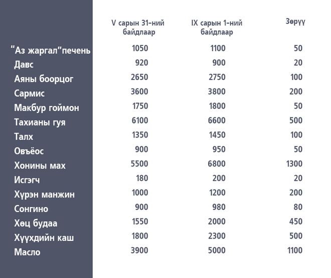 Бараа бүтээгдэхүүний үнэ өдрөөс өдөрт нэмэгдэж байна. Жишээлбэл, 226-р цэцэрлэг энэ оны тавдугаар сард хонины махыг 5500 төгрөгөөр авч байсан бол есдүгээр сард 1300 төгрөгөөр үнэ нь өсчээ. Мөн хүүхдийн каш, тахианы гуя тус бүр 500 төгрөгөөр, масло 1100 төгрөгөөр, хүрэн манжин 200, сонгино 80 төгрөг зэргээр нэмэгджээ.