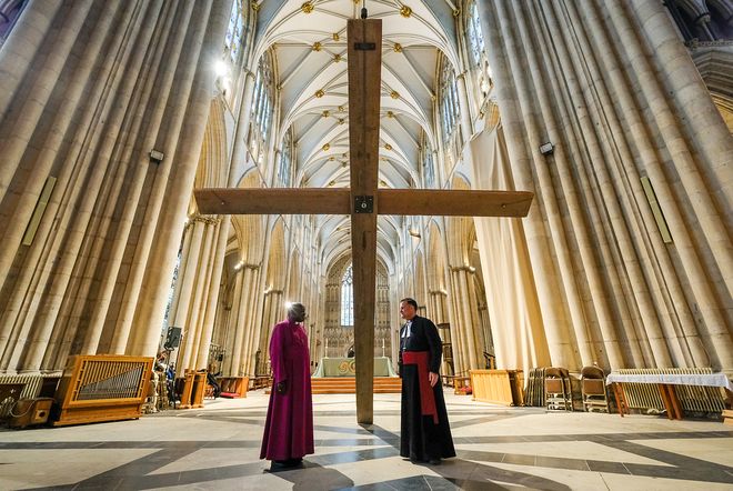 ИХ БРИТАНИ: Йоркийн дацангийн тайзнаас зүүлттэй модон загалмайн дэргэд зогсож байгаа лам нар. 1220 онд боссон сүм Европдоо дундад зууны хамгийн том гэдгээр Кельны сүмтэй өрсөлддөг.