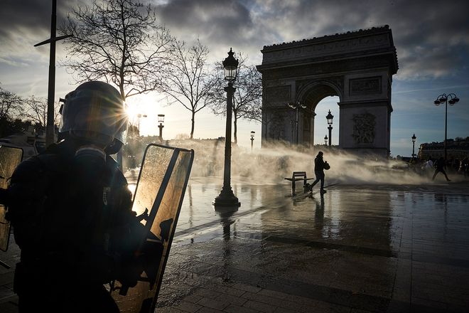ПАРИС: Ялалтын хаалганы дэргэдээс цагдаагийнхан усан буугаар шар хантаазтануудыг хөөлөө.
