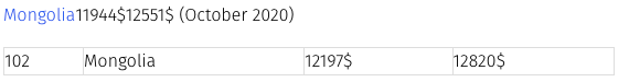 Баялаг тансаг амьдралын рейтингээр манай улс энэ ертөнцөд хаагуурхан шиг явдаг юм бол? Манай дэлхийн 200 орчим улс орныг жагсаасан байх агаад манай улсыг википедиад ингэж оруулжээ. International Comparison Program, World Bank|World Development Indicators database, World Bank сайтаас:
