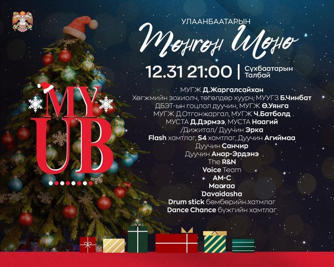 Төв талбайд шинэ оныг угтах "Улаанбаатарын мөнгөн үдэш" арга хэмжээ 21 цагт эхэлнэ. Баярт ардын жүжигчин Д.Жаргалсайхан, хөгжмийн зохиолч, төгөлдөр хуурч УГЗ Б.Чинбат, ДБЭТ-ын гоцлол дуучин, МУГЖ Ө.Уянга, МУГЖ Д.Отгонжаргал, дуучин Наагий, Эрка, S4 хамтлаг, Flash хамтлаг, дуучин Э.Агиймаа, AM-C, Davaidasha зэрэг уран бүтээлчид оролцож ая дуугаа өргөх юм.