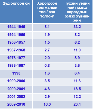 Эдгээрээс 2009-2010 оны өвөл одоогийнх шиг төмөр зуд нүүрлэсэн бөгөөд манай орны нутаг дэвсгэрийн 80.9 хувь буюу 18 аймгийн 175 суманд 97.5 малчин өрх нэрвэгдэж байв. Нийт малын 23.4 хувь буюу 10.3 сая толгой мал хорогдож, зах зээлийн дундаж үнээр 570 тэрбум төгрөгийн хохирол учирсан байна.