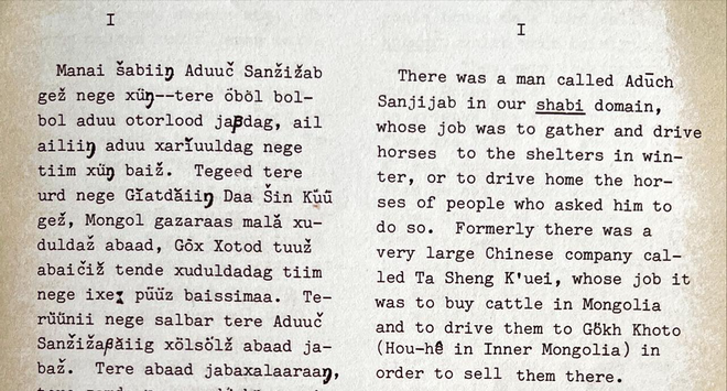Манай шавийн адууч Санжжав гэж нэг хүн, тэр өвөл болбол адуу оторлоод явдаг, айл айлын адуу хариулдаг, нэг тийм хүн байж. Тэгээд тэр урд нэг Хятадын Даашинхүү гэж, Монгол газраас мал худалдаж аваад Хөх хотод тууж аваачиж, тэнд худалддаг тийм нэг их пүүс байсан юм аа. Тэрүүний нэг салбар тэр адууч Санжжавыг хөлсөлж аваад явж. Тэр аваад явахлаараа, тэр замдаа нэг дөрвөн морь (тэд нар морь унаж явсан юм байна) тэр майхны данжаад нар тэр. Тэгээд нэг бас хоёр сул морьтой, тэгээд нэг тийм дөрвөн морь тэр маллаж явсан юм. Тэгээд нэг шөнө буудал дээрээс нэг өвстэй газар, хөдөө аваачиж, тэр морио өвсөн дээр тавьчхаад дэргэд нь тэр түүнийгээ манаж хонодог. Түүний ажил нь ер нь тийм л юм гэнэ.