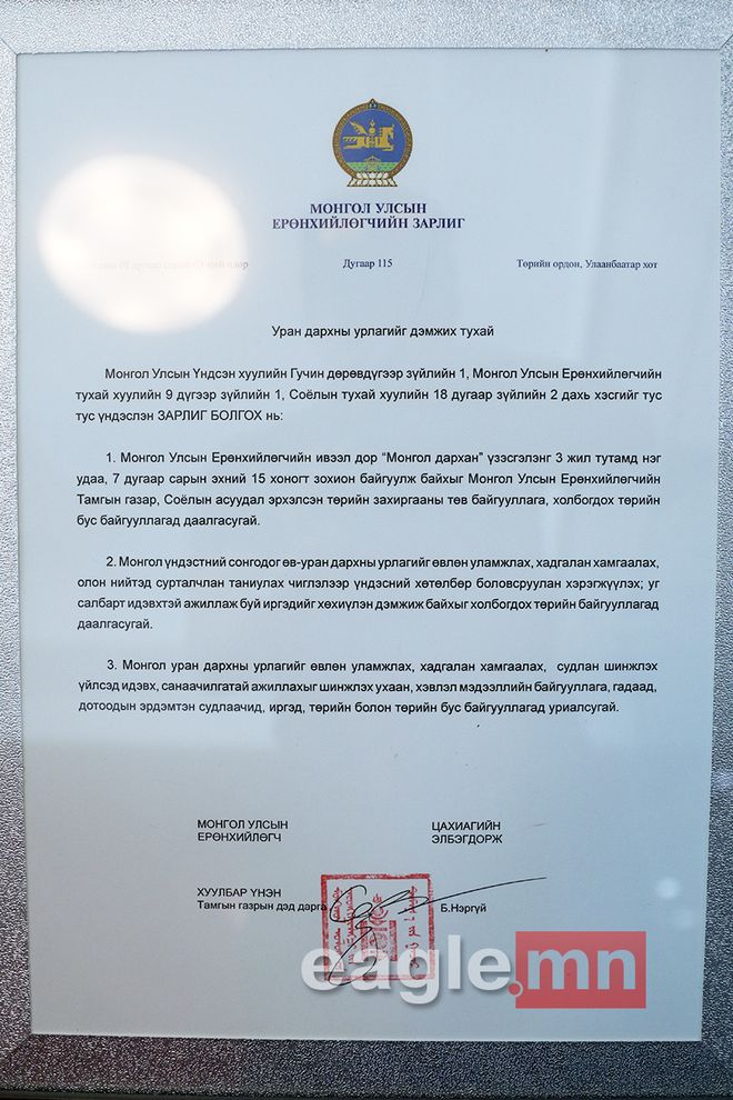 -Д.Гэрэл: Тийм. Энэ зарлиг гарсан. Ерөнхийлөгч энэ зарлигийг гарган манай С.Батзориг бид хоёрт нэг хувийг нь хүргүүлсэн. Энэ нь холбоо энэхүү үзэсгэлэнг гурван жилд нэг удаа зохион байгуулахад гол субъект нь шүү гэдгийг нэгдүгээрт анхааруулсан. Хоёрдугаарт Боловсрол, соёл, шинжлэх ухаан спортын сайдад, нэг хувийг нь МҮОНРТ-ийн удирдлагад хүргүүлсэн.