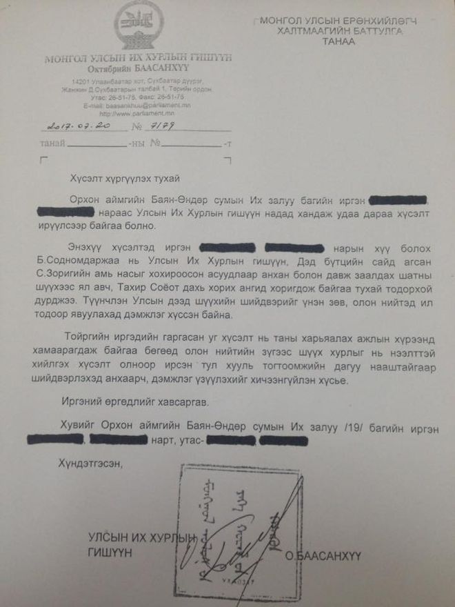 Иймд УИХ-ын гишүүн О.Баасанхүү Ерөнхийлөгч Х.Баттулгад ханджээ. Тэрээр Орхон аймгаас УИХ-д сонгогдон ажиллаж байгаа юм.