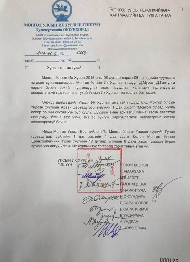 УИХ дахь эмэгтэй гишүүдийн төлөөлөл хоёр гишүүний бүрэн эрхийг түдгэлзүүлэхээс татгалзсан тогтоолын төсөлд хориг тавиулахаар Ерөнхийлөгчид хандсан. УИХ дахь эмэгтэйчүүдийн албан бус бүлгийн дарга Д.Оюунхорол Монгол Улсын Ерөнхийлөгч Х.Баттулгад "Өнгөрсөн баасан гаригийн чуулганаар УИХ-ын гишүүн Д.Мурат, Д.Баттулга нарын бүрэн эрхийг түдгэлзүүлэхгүйгээр авч үлдсэнийг эсэргүүцэж хориг тавьж өгөөч гэж хандсан" гэлээ. Д.Гантулга гишүүн бүрэн эрхээсээ чөлөөлөгдөх хүсэлтээ гаргасан учраас одоо энэ асуудал зөвхөн Д.Мурат гишүүнд хамаатай болж үлдлээ. Тэрээр Д.Гантулга гишүүн шиг ямар нэгэн үйлдэл хийхгүй бол Ерөнхийлөгч түүнийг хамгаалан авч үлдсэн УИХ-ын тогтоолын төсөлд хориг тавихыг үгүйсгэхгүй. Ингэсэн тохиолдолд алдах юмгүй болсон УИХ дахь олонхийн бүлэг Ерөнхийлөгчийн хоригийг үг дуугүй хүлээн авах нь ойлгомжтой. Учир нь, өнгөрсөн удаад хоёр намын бүлгийн нэг нэг гишүүний асуудал яригдсан учраас тохиролцооны зарчмаар хоёуланг нь авч үлдсэн нь нууц биш. Харин одоо Д.Мурат гишүүн барьцах ханьгүй боллоо.