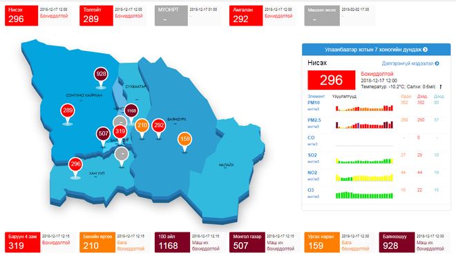 Нийслэл хотын агаарын чанарын индексийг харуулдаг agaar.mn сайтын мэдээллээс хүргэж байна. Улаанбаатар хотын агаарын бохирдол 12.00 цагийн мэдээгээр 100 айл орчимд хамгийн их бохирдолтой буюу 1168-ыг зааж байна. Мөн Баянхошуу орчимд 928, Монгол газар орчимд 507-ыг заажээ. Агаар бохирдуулах бодисуудын 24 цагийн дундаж агууламжийн хамгийн их нь агаарын чанарын стандартаас 3.3-6.8 дахин их байна.