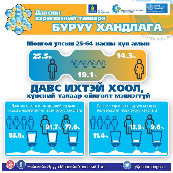 -Дэлхийн улс орон бүр энэ тал дээр анхаарсны хүчинд 2012 онд Нийгмийн эрүүл мэндийн үндэсний төв үндэсний хэмжээнд монголчуудыг давсны хэрэглээний судалгааг хийсэн. Судалгаагаар монголчуудын давсны хэрэглээ байх ёстойгоос 2.5 дахин их, баруун аймгуудад 3 дахин их, зүн бүсдээ 7-8 грамм байна гэж гарсан.