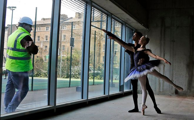 Лондоны балетын сургуулийн Брендон Бреретон, Эмили Пол хоёрын бүжиглэхийг сонирхож байгаа ажилчин.
