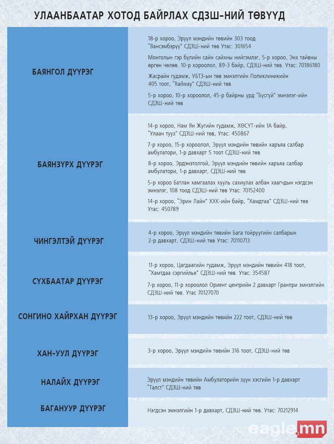Сайн дурын зөвлөгөө, шинжилгээ авдаг Улаанбаатар хотод байрлах Сайн дурын зөвлөгөө шинжилгээний төвүүдийн хаягийг хүргэж байна.