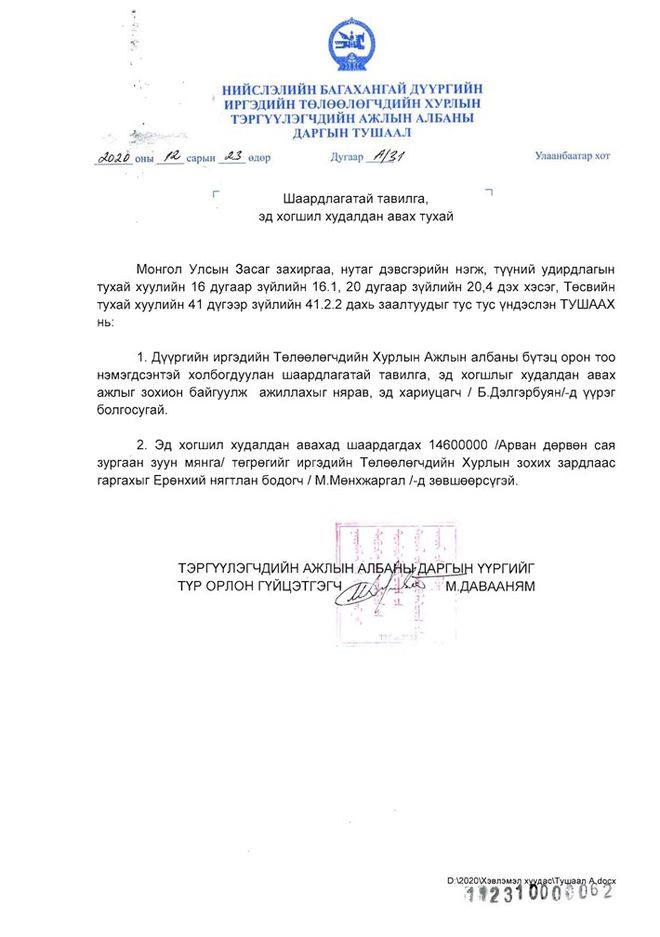 Цар тахлаас шалтгаалан эдийн засаг хүндэрч байгаа ч ажлын байраа хадгалж үлдэхийг Засгийн газраас чиглэл болгож байгаа. Үүний дагуу аж ахуйн нэгжүүд ажил нь зогсонги байдалд шилжсэн ч ажлын байраа хадгалж байгаа бол зарим төрийн байгууллага орон тоогоо нэмжээ. Тодруулбал, Багахангай дүүргийн ИТХ-ын ажлын алба орон тоогоо нэмсэн байна. Үүнтэйгээ холбогдуулан тус дүүргийн ИТХ-ын Тэргүүлэгчдийн ажлын албаны даргын үүргийг түр орлон гүйцэтгэгч М.Давааням тушаал гарган 14 сая 600 мянган төгрөгөөр тавилга, эд хогшил худалдан авахаар болжээ.