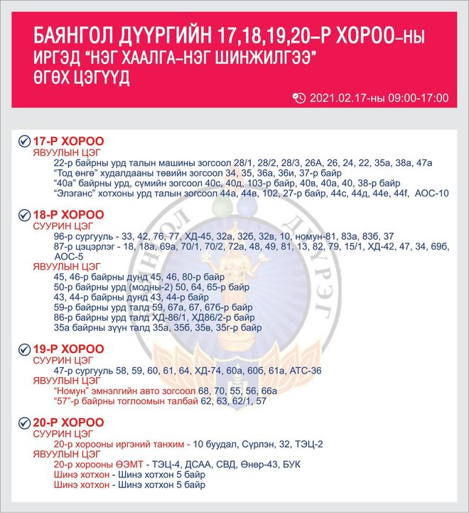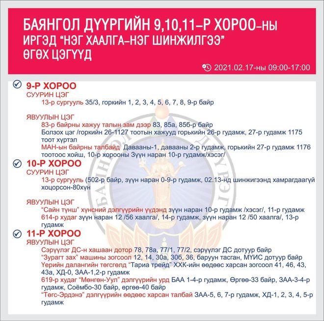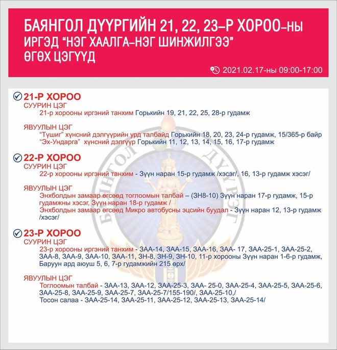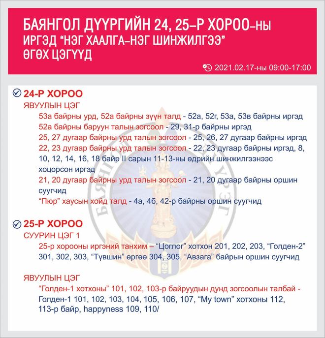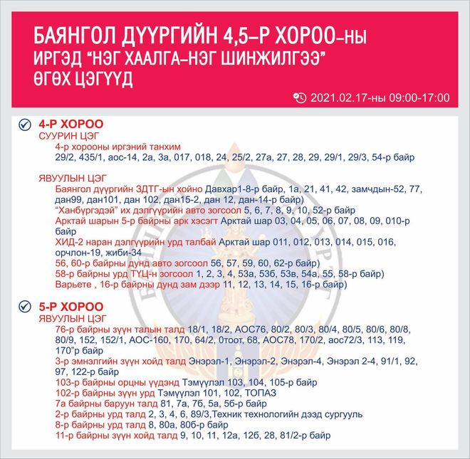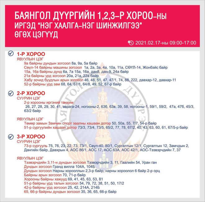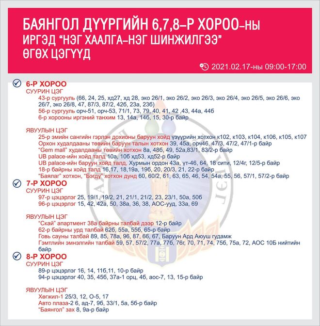 Харин хоёрдугаар сарын 11-13-нд шинжилгээнд хамрагдсан иргэд энэхүү шинжилгээнд дахин хамрагдахгүй аж.
