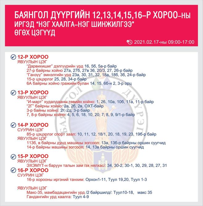 Хуваарийн дагуу өнөөдөр Баянгол дүүргийн өрх бүрээс нэг иргэнийг коронавирусийн халдвар илрүүлэх шинжилгээнд хамруулах юм. Өргөтгөсөн шинжилгээг суурин 21 цэг, явуулын 97 цэгт авна. Иргжд шинжилгээ өгөхөөр очихдоо иргэний үнэмлэхээ авч очих шаардлагатай юм.