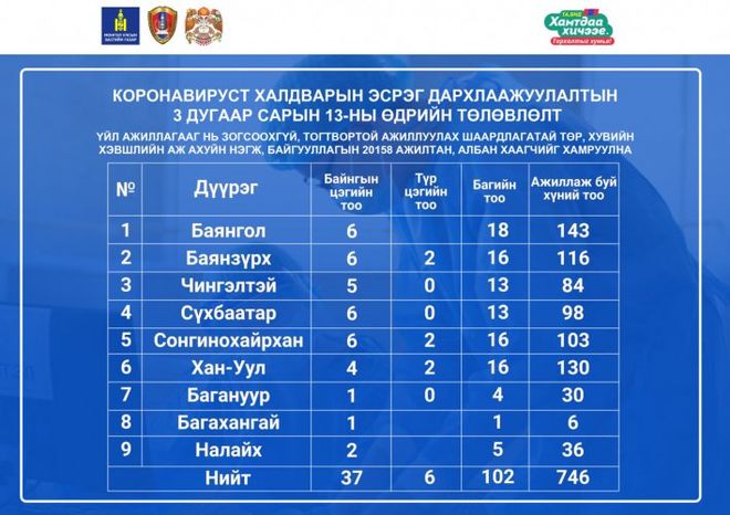 Нийслэлийн хэмжээнд өнөөдөр 43 цэгт коронавирусийн эсрэг вакцин хийнэ. Нийслэлийн есөн дүүргийн 43 цэгт 102 багийн 746 эмч ажилтан ажиллаж, үйл ажиллагааг нь зогсоохгүй, тогтвортой ажиллуулах шаардлагатай байгууллагуудын 20158 хүнийг дархлаажуулалтад хамруулахаар төлөвлөжээ.
