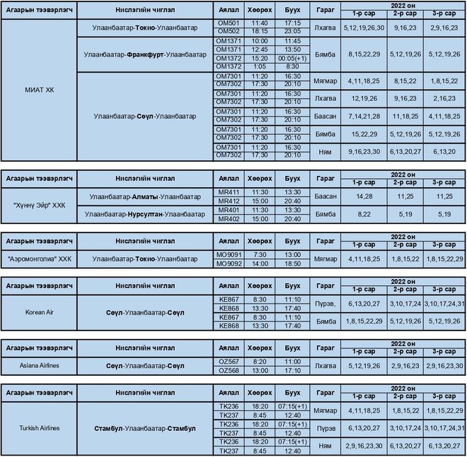 Иргэний нисэхийн ерөнхий газраас 2022 оны эхны улиралд үйлдэх олон улсын нислэгийн хуваарийг гаргажээ. Тодруулбал, Токио, Франкфурт, Сөүл, Алматы, Нурсултан хотууд руу хуваарийн дагуу нислэг үйлдэнэ.Зорчигчид дараах зүйлсийг анхаарах шаардлагатай. Үүнд: