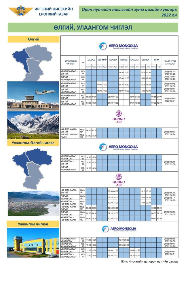 Иргэний нисэхийн ерөнхий газраас 2022 оны зуны буюу гуравдугаар сарын 27-ны өдрөөс 10 дугаар сарын 29-ний өдөр хүртэлх орон нутгийн нислэгийн цагийн хуваарийг баталлаа. Агаарын тээврийн компаниуд энэхүү цагийн хуваарийн дагуу нислэгийн хуваарь, төлөвлөлтөө зохион байгуулах шаардлагатай гэдгийг Иргэний нисэхийн ерөнхий газраас мэдээллээ.