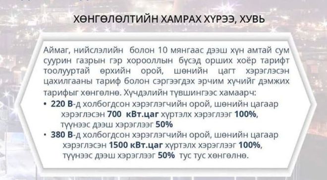 "Гэр хорооллын айл өрхөд цахилгаан эрчим хүчний тарифын хөнгөлөлт үзүүлэх журам”-ын дагуу гэр хорооллын айл, өрхийн орой, шөнийн цагт хэрэглэсэн цахилгааны тарифт улсаас хөнгөлөлт үзүүлдэг.