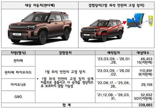 Hyundai Motor 4 загварын нийт 239 683 автомашиныг, үүнд Santa Fe спорт хэрэглээний автомашин (SUV) багтаж байгаа бөгөөд суудлын бүсний доголдлоос шалтгаалан ослын үед зорчигчийг хангалттай хамгаалж чадахгүй байх эрсдэлтэй гэж үзжээ. Мөн тусдаа байдлаар Elec City маркийн 202 нийтийн тээврийн автобусыг их биеийн дээд хүрээнд ан цав үүсэх эрсдэлтэй гэх шалтгаанаар эргүүлэн татна.