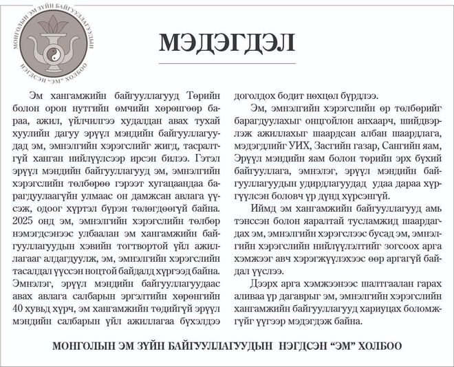 Иймд эм хангамжийн байгууллагууд амь тэнссэн болон яаралтай тусламжид шаардагдах эм, эмнэлгийн хэрэгслээс бусад эм, эмнэлгийн хэрэгслийн нийлүүлэлтийг зогсоох арга хэмжээг авч хэрэгжүүлэхээс өөр аргагүй байдал үүслээ. Дээрх арга хэмжээнээс шалтгаалан гарах аливаа үр дагаврыг эм, эмнэлгийн хэрэгслийн хангамжийн байгууллагууд хариуцах боломжгүйг үүгээр мэдэгдэж байна хэмээн Монголын эм зүйн байгууллагуудын нэгдсэн “Эм” холбооноос мэдэгдлээ.