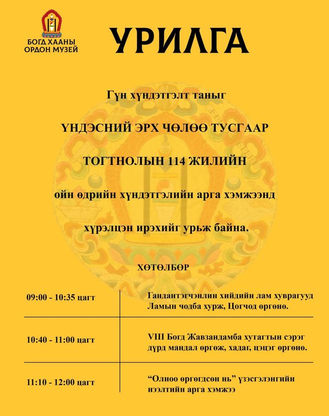 Богд хааны Монголын төрийн тусгаар тогтнолыг анх зориглон тогтоож чадсан, 1911-1924 оны хооронд бие даасан улсын дотоод зохион байгуулалтыг хийсэн, Монгол улсыг хил хязгаарыг тогтоосон, Монгол улсын хууль цаазыг тогтоосон, Монголчуудын эрх чөлөөнд хүрсэн түүхэн өдөрт зориулсан “Олноо өргөгдсөн нь” үзэсгэлэнгийн хүндэтгэлийн арга хэмжээнд олон түмнийг өргөнөөр хүрэлцэн ирэхийг урьж байна.