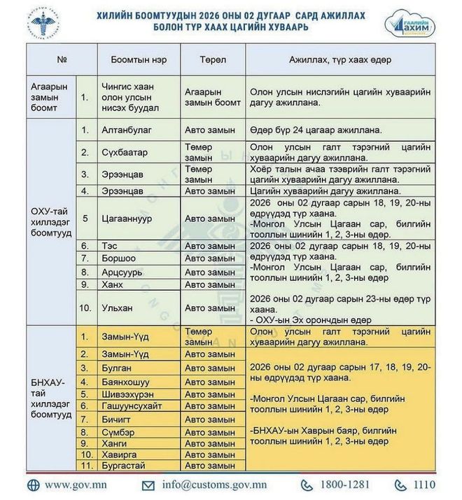 Харин Замын-Үүд авто замын боомт 2026 оны хоёрдугаар сарын 21-ний өдрийн 08:00 цагаас эхлэн нээж, хэвийн ажиллана.