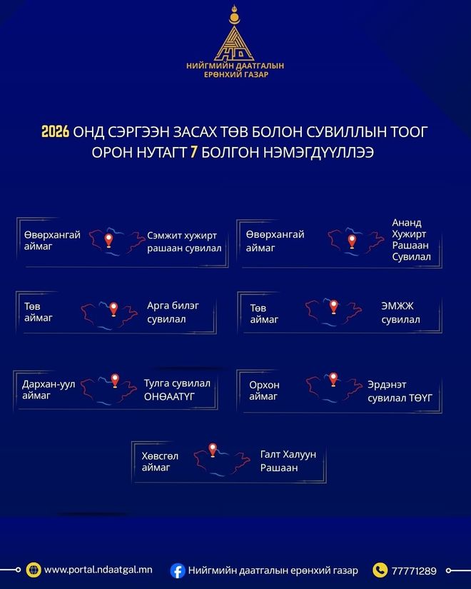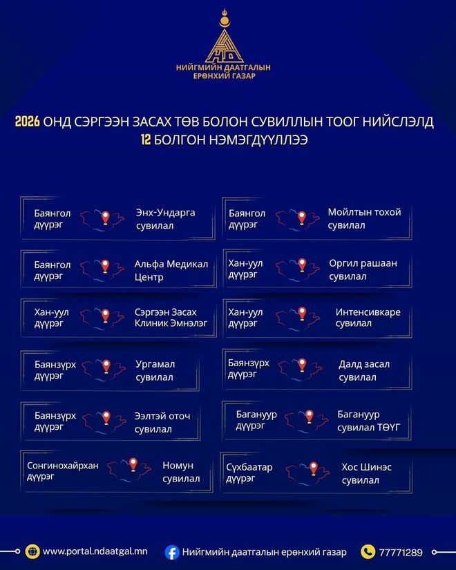 Ингэснээрээ хөдөлмөрийн чадвар алдсан даатгуулагчид үзүүлэх сэргээн засах тусламж, үйлчилгээний хүртээмж нэмэгдэх аж. Дараах нэр бүхий 19 сувилалд Хөдөлмөрийн чадвар алдсан даатгуулагчид тусламж үйлчилгээ авах боломж бүрджээ.