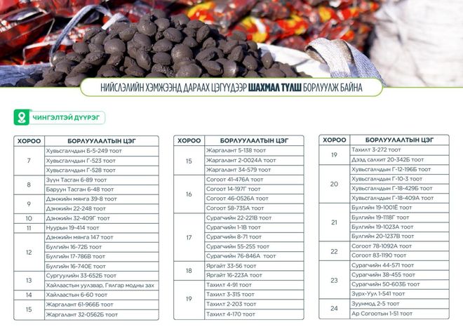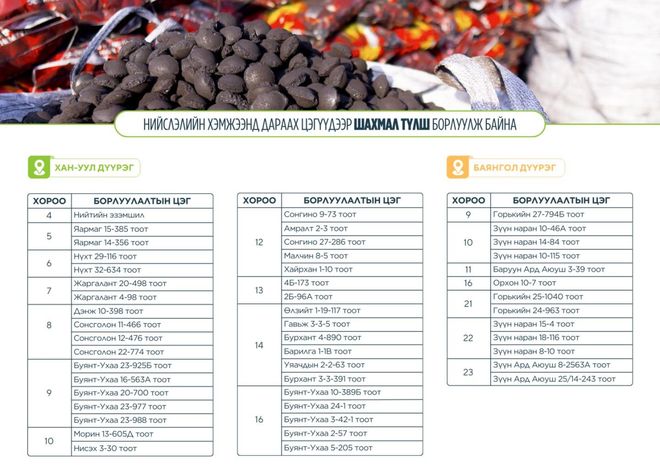 "Нийслэлийн долоон дүүрэгт миддлингийн шахмал түлш худалдаж байгаа дараах цэгүүдэд хагас коксон түлшийг хамтад нь худалдана. Иргэд сонголтоороо авна" хэмээн НЗДТГ-ын хэвлэлийн хэлтсээс мэдээллээ.
