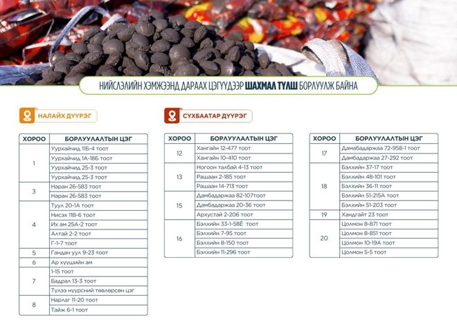 25 килограммын шуудай хагас коксон түлшийг 5000 төгрөгөөр иргэдэд худалдаалах бөгөөд иргэний үнэмлэхний QR код, Hotula аппликэйшн болон сайн карт ашиглан төлбөрөө төлөх боломжтой аж.