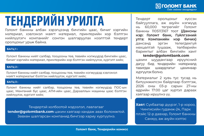 Голомт банк – Тендерийн урилга