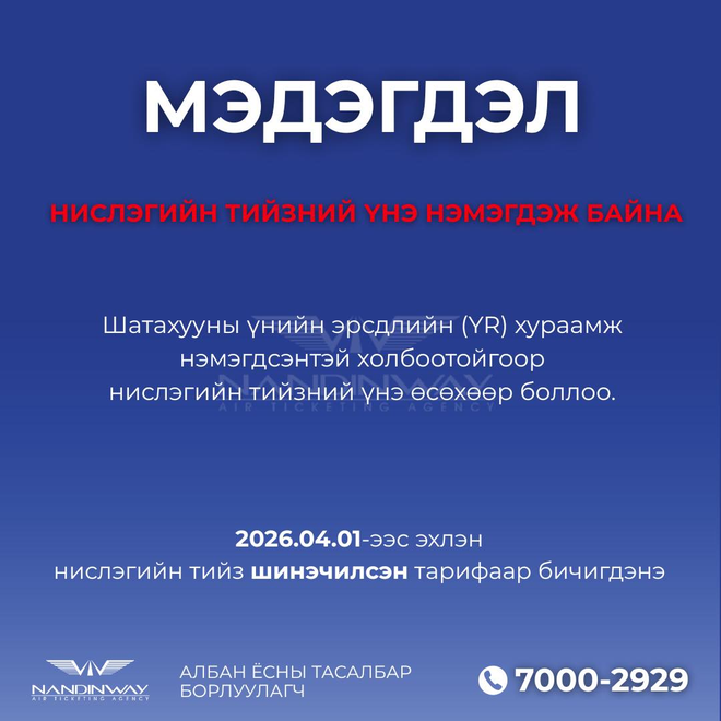 Харамсалтай нь онгоцны шатахууны үнийн өсөлттэй холбоотой тийзний үнийн нэмэгдэл манай агаарын тээврийн салбарт ч бас нөлөөлөх нь тодорхой. Эхнээсээ тийзний үнэ өнөөдөр (2026.04.01)-өөс нэмэгдэнэ гэдгийг анхааруулсан мэдэгдлээ олон нийтийн сүлжээгээр нийтлээд эхэлжээ.