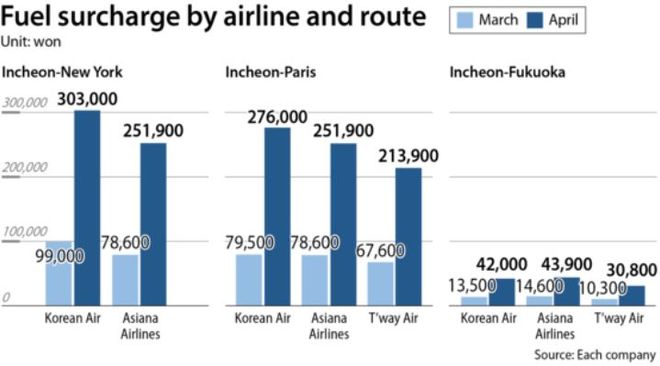 Korean Air компани 4-р сараас эхлэн гаргасан тасалбарууд дээр шатахууны нэмэлт хураамжаа огцом нэмэгдүүлсэн бөгөөд хамгийн урт чиглэлүүд болох 6500 милиэс дээш зайтай нислэгүүд (үүнд Инчон–Нью-Йорк, Торонто чиглэл багтана)-ийн нэг талын хураамж 3 дахин нэмэгдэж, 3-р сард 99 900 вон байсан бол 303 000 вон болж өсжээ. Энэ нь зорчигч бүрд хоёр талын тасалбар дээр нэмэлт 400 000 воны зардал үүсгэнэ гэсэн үг юм. Харин дөрвөн хүнтэй гэр бүлд энэ нь нийтдээ 1.6 сая вон хүртэл нэмэлт ачаалал болох юм.
