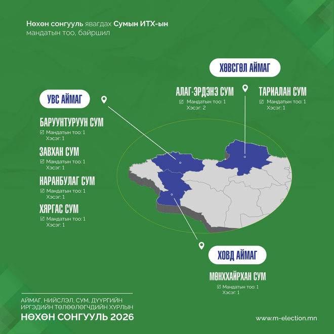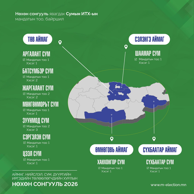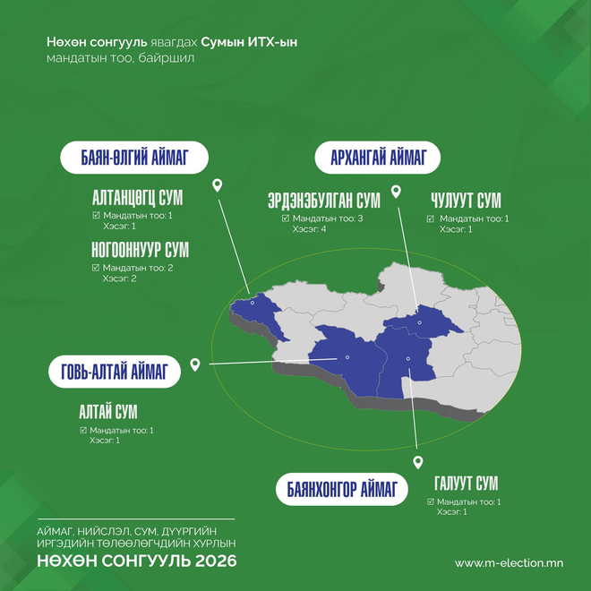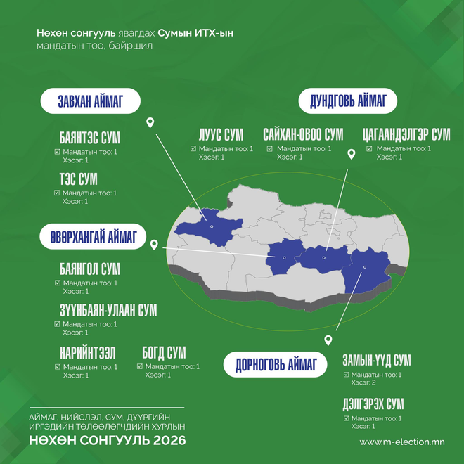 Хуульд заасан хугацаанд 16 аймгийн 43 сумын нийт 73 сонгуулийн хэсэгт нөхөн сонгууль явуулахаар товлон зарласан тогтоолыг Сонгуулийн ерөнхий хороонд ирүүллээ. Тодруулбал, 2026 онд таван аймгийн есөн сумын 29 хэсэгт аймгийн иргэдийн Төлөөлөгчдийн Хурлын 9 мандатад нөхөн сонгууль, 15 аймгийн 33 сумын 44 хэсэгт сумын иргэдийн Төлөөлөгчдийн Хурлын 39 мандатад нөхөн сонгууль зохион байгуулахаар боллоо.