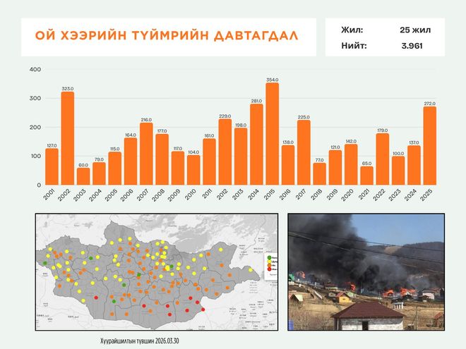Монгол Улсад сүүлийн 25 жилийн хугацаанд нийт 3961 удаагийн ой, хээрийн түймэр бүртгэгдсэн байна. Цаг уур, орчны шинжилгээний байгууллагын тайлангаас үзэхэд 2002, 2015, 2025 онуудад түймрийн тоо хамгийн өндөр байжээ.