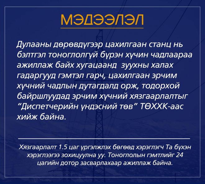Дулааны дөрөвдүгээр цахилгаан станц нь бэлтгэл тоноглолгүй бүрэн хүчин чадлаар ажиллаж байгаа бөгөөд ажиллах хугацаанд зуухны халах гадаргууд гэмтэл гарчээ. Улмаар цахилгаан эрчим хүчний чадлын дутагдалд орсон тул “Диспетчерийн үндэсний төв” ТӨХХК-аас тодорхой байршлуудад эрчим хүчний хязгаарлалтыг хийж байгааг Эрчим хүчний яам мэдээллээ.