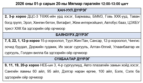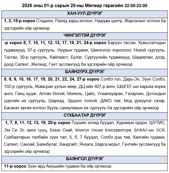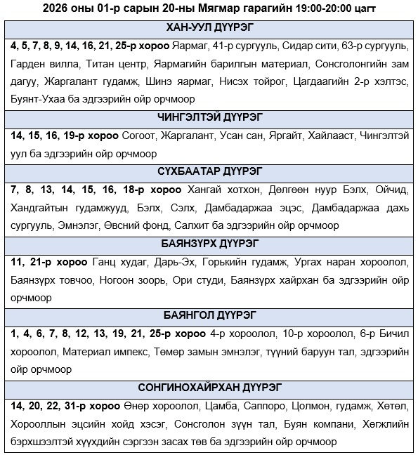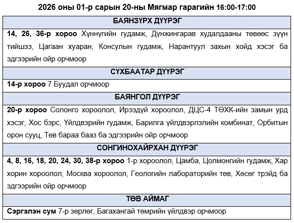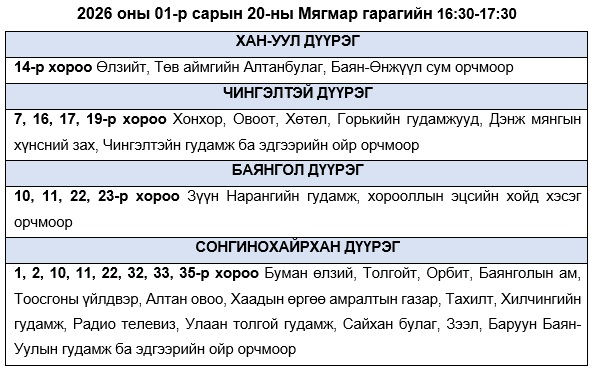 Хязгаарлалт 1 цаг 30 минут орчим үргэлжлэх бөгөөд энэ хугацаанд хэрэглээгээ зохицуулахыг иргэдээс хүсжээ. Тоноглолын гэмтлийг 24 цагийн дотор засварлахаар ажиллаж байна.