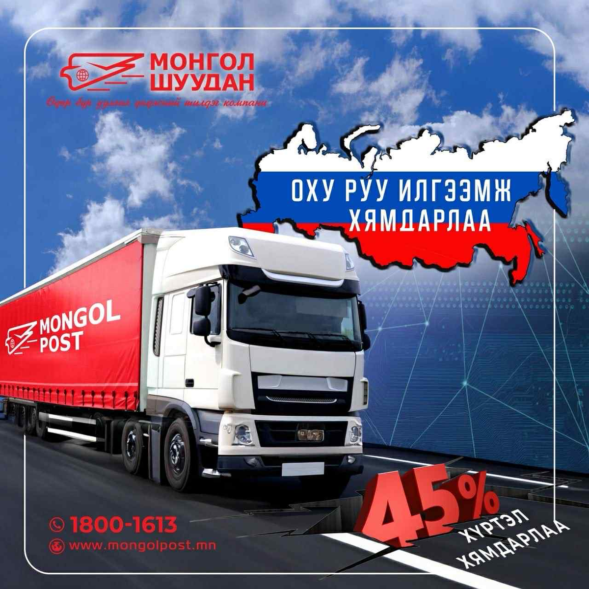Монгол Шуудан ХК нь Оросын Холбооны Улс руу илгээх илгээмж, бараа бүтээгдэхүүний хүргэлтийн үнийг 45 хүртэл хувиар бууруулж, үндэсний үйлдвэрлэгч онлайн худалдаа эрхлэгчдэд экспортоо хямд өртгөөр, илүү үр ашигтай хүргэх боломж бүрдүүллээ.