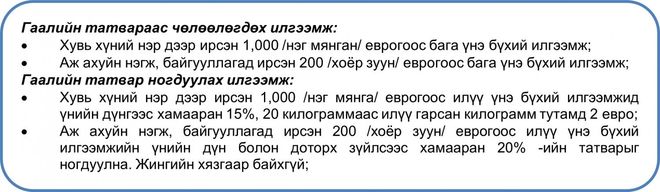 Санамж: Гаалийн байгууллагууд арилжааны шинжтэй илгээмжид татвар ногдуулж болох бөгөөд хувийн хэрэгцээнд зориулсан илгээмж татвараас чөлөөлөгдөх боломжтой.