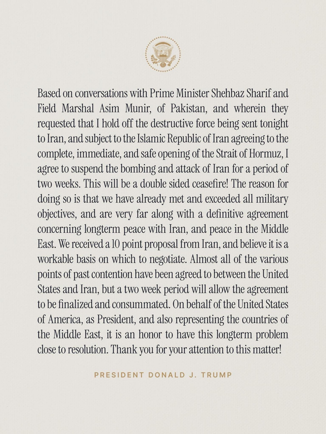 Пакистан улсын Ерөнхий сайд Шахбаз Шариф болон Дээд маршал Асим Мунир нартай хийсэн ярианы үндсэн дээр, мөн тэдний өнөө орой Иранд илгээх гэж байсан сүйтгэх хүчийг түр хойшлуулахыг хүссэнтэй холбогдуулан, Ираны Исламын Бүгд Найрамдах Улс Ормузын хоолойг бүрэн, яаралтай, аюулгүй нээхийг зөвшөөрөх нөхцөлтэйгөөр би Ираны эсрэг явуулж буй бөмбөгдөлт болон дайралтыг хоёр долоо хоногийн хугацаанд зогсоохыг зөвшөөрч байна. Энэ нь хоёр талын гал зогсоох тохиролцоо байх болно.