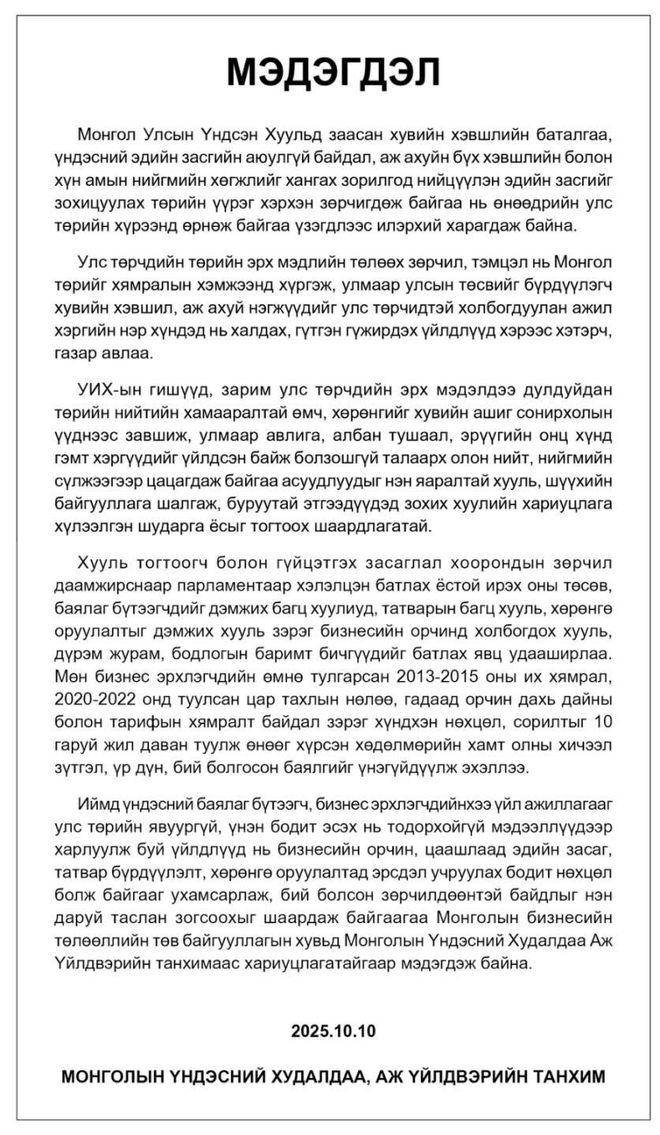 Бизнесийн салбар, хувийн хэвшлийн нэр хүндэд халдах, бизнесийн үйл ажиллагааг улс төрийн өнцгөөс дүгнэх хандлага газар авч байгааг эсэргүүцэн дараах мэдэгдлийг гаргажээ.