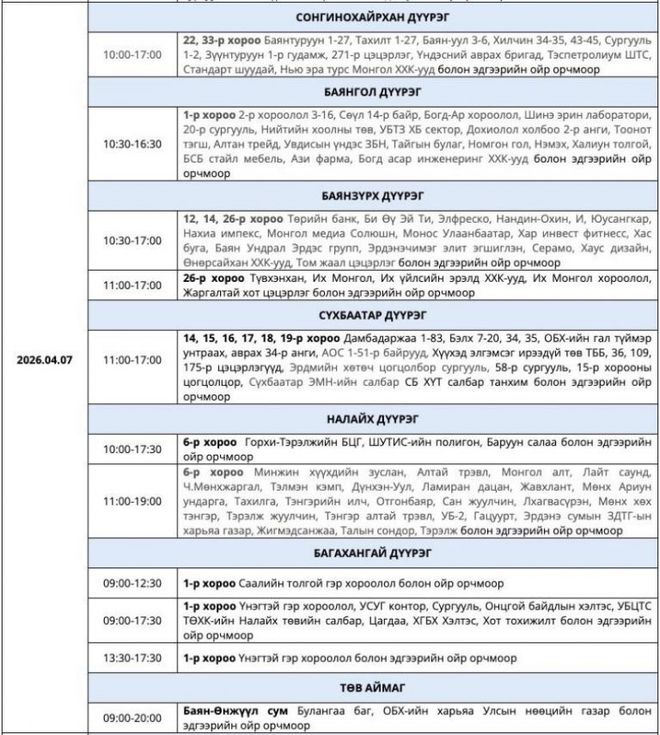 Түүнчлэн Төв аймгийн Баян-Өнжүүл суманд 09:00-20:00 цагт цахилгаан хязгаарлах юм байна.
