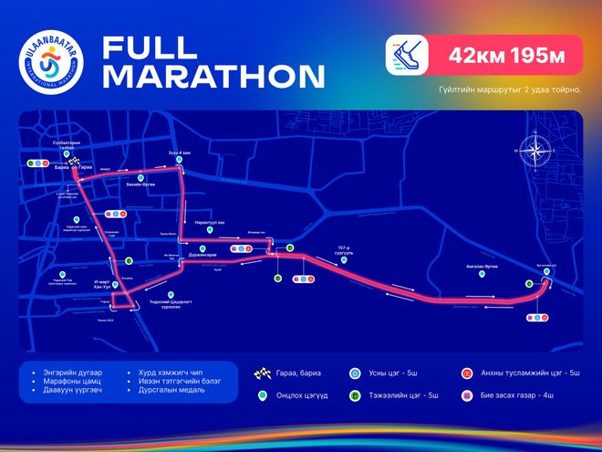 Нийслэлийн биеийн тамир, спортын газраас 42 км 195м болон 21 км 095м зайн гүйлтийн албан ёсны маршрутыг өчигдөр баталжээ. Энэ удаагийн замын хэмжилтэнд Азийн хөнгөн атлетикийн холбооны мэргэжилтэнд оролцсон байна. Уг маршрут нь тамирчдын гүйлтэд таатай байхаас гадна Улаанбаатар хотын төвийн гол гудамж, өргөн чөлөөг хамарснаараа онцлог болжээ.