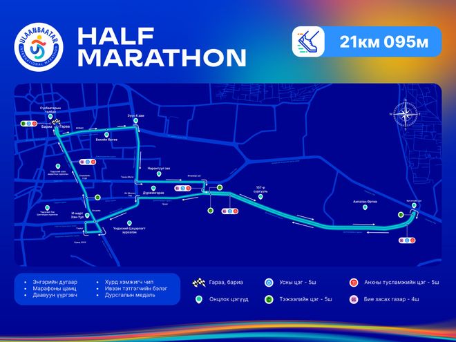 21 км 095м зайд гүйх гүйгчид төв талбайгаас гараа хийж зүүн дөрвөн зам, “Нарантуул” худалдааны төв, Амгалан өртөөгөөр эргэн Үндэсний цэцэрлэгт хүрээлэнгээр дамжин барианд орно. Энэ зам нь өнгөрсөн жилийн замтай адил гэдгийг зохион байгуулагчид онцоллоо.