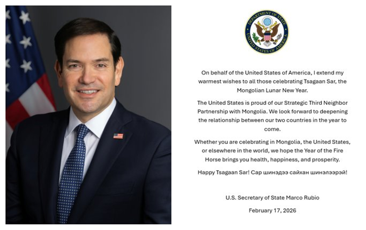 Америкийн Нэгдсэн Улсын Төрийн Нарийн бичгийн дарга Марко Рубио Сар шинийн баярыг тохиолдуулан Монголын ард түмэнд баяр хүргэж, мэндчилгээ дэвшүүлэв.