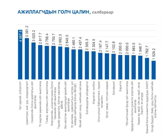 Хамгийн өндөр цалинтай салбар уул, уурхай олборлолт байгаа бол зочид буудал, байр сууц болон нийтийн үйлчилгээний салбарт цалин хамгийн бага түвшинд байна.