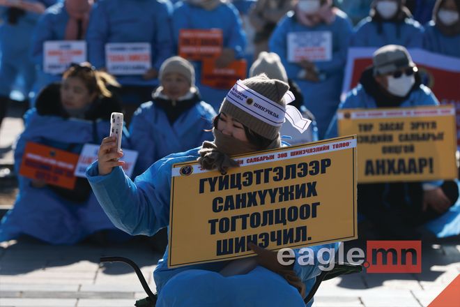 Эмч нарын төлөөлөл “Эмч нар цалингаа нэмүүлэхээр найман хоног хүйтэн шалан дээр суулт хийж байхад УИХ, Засгийн газраас нэг ч хүн гарч ирж уулзсангүй. Өнөөдөр бид үндсэн цалингаа 3.5 сая төгрөгт хүргэхийн төлөө жагсаж байгаа. Засгийн газрын зүгээс 15 хувиар нэмнэ гэх зүйлсийг ярьж байна. Энэ хувиар нэмэх бол 200.000 төгрөгөөр л нэмэгдэнэ гэсэн үг. Бид үүний төлөө жагсаагүй.