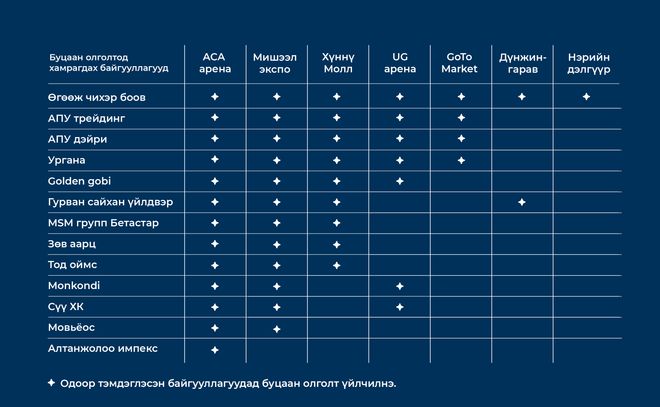 Буцаан олголт үйлчлэх байгууллагууд нь цагаан сарын томоохон үзэсгэлэн худалдаа, экспо дээр ажиллаж байгаа тул та сар шинийн бэлтгэлээ базааж, худалдан авалт хийхдээ Голомт банкны кредит картаа заавал ашиглаарай.