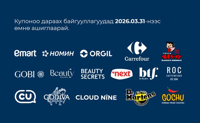 Нэмж дурдахад 2026.02.01-2026.02.18-ны хооронд кредит карт шинээр захиалж, анхны гүйлгээгээ амжилттай хийсэн харилцагчдад 30,000₮-ийн купон бэлэглэх урамшуулал давхар хэрэгжиж байна. Кредит карт шинээр захиалж, амжилттай гүйлгээ хийсэн харилцагчид SocialPay аппликэйшний “Нэмэлт цэс-Миний купон” цэсээр дамжуулан купоноо шалгах бөгөөд купон тань 2026.03.31-нийг дуустал хүчинтэй байна. Купоныг зөвхөн доор дурдсан байгууллагууд дээр ашиглах боломжтой.