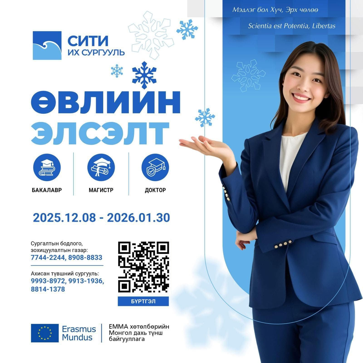 “СИТИ” Их сургуулийн 2025-2026 оны хичээлийн жилийн өвлийн элсэлт үргэлжилж байна. Мэдлэг бол Хүч, Эрх чөлөө уриатай “СИТИ” Их сургууль ирээдүйн манлайлагчдыг бэлтгэх, олон улсын стандартын дагуу боловсрол олгох зорилготойгоор 40 гаруй хөтөлбөрийг танд санал болгож байна.